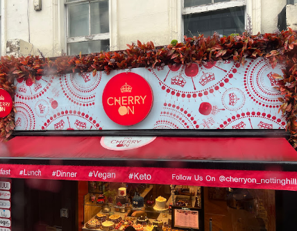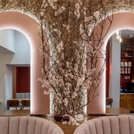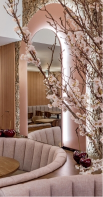Five primary colours were chosen for this restaurant. White, like the cherry flowers, dark red, blue, baby pink and blue with black decorations. This colour palette creates a cosy space to enjoy food with family and friends.