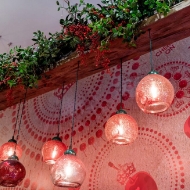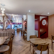 You spot a stylish cocktail bar with desserts when you enter the restaurant through a big wooden door. There are three seat boxes for bigger groups under the tree. Behind the glass is an even bigger space to enjoy food and drinks or organise an event or a celebration.