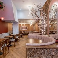 The furniture is designed to match the theme. There is a live cherry tree and lamps in its shape, which all make you feel like you are in a cherry orchard where many of us spent our childhood.