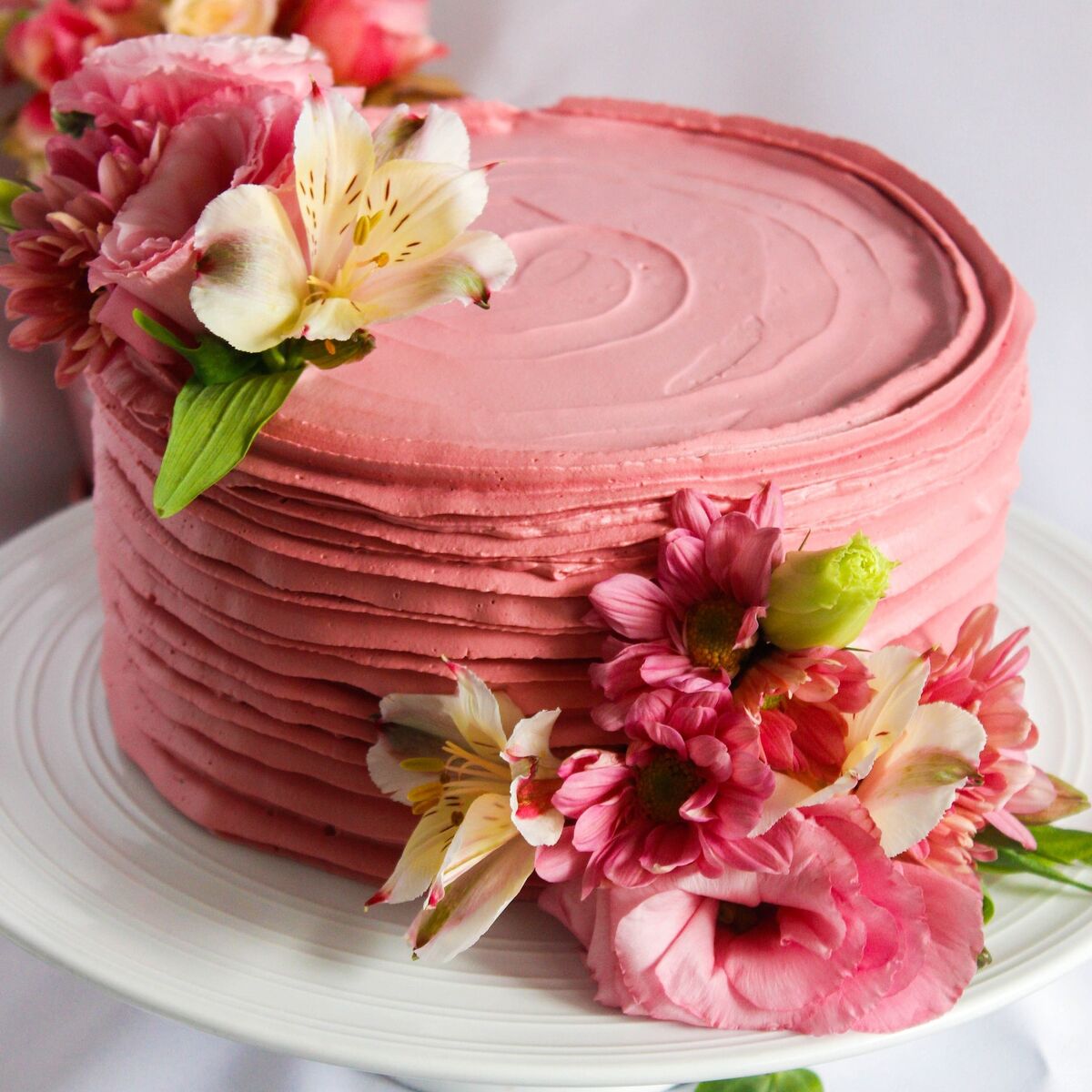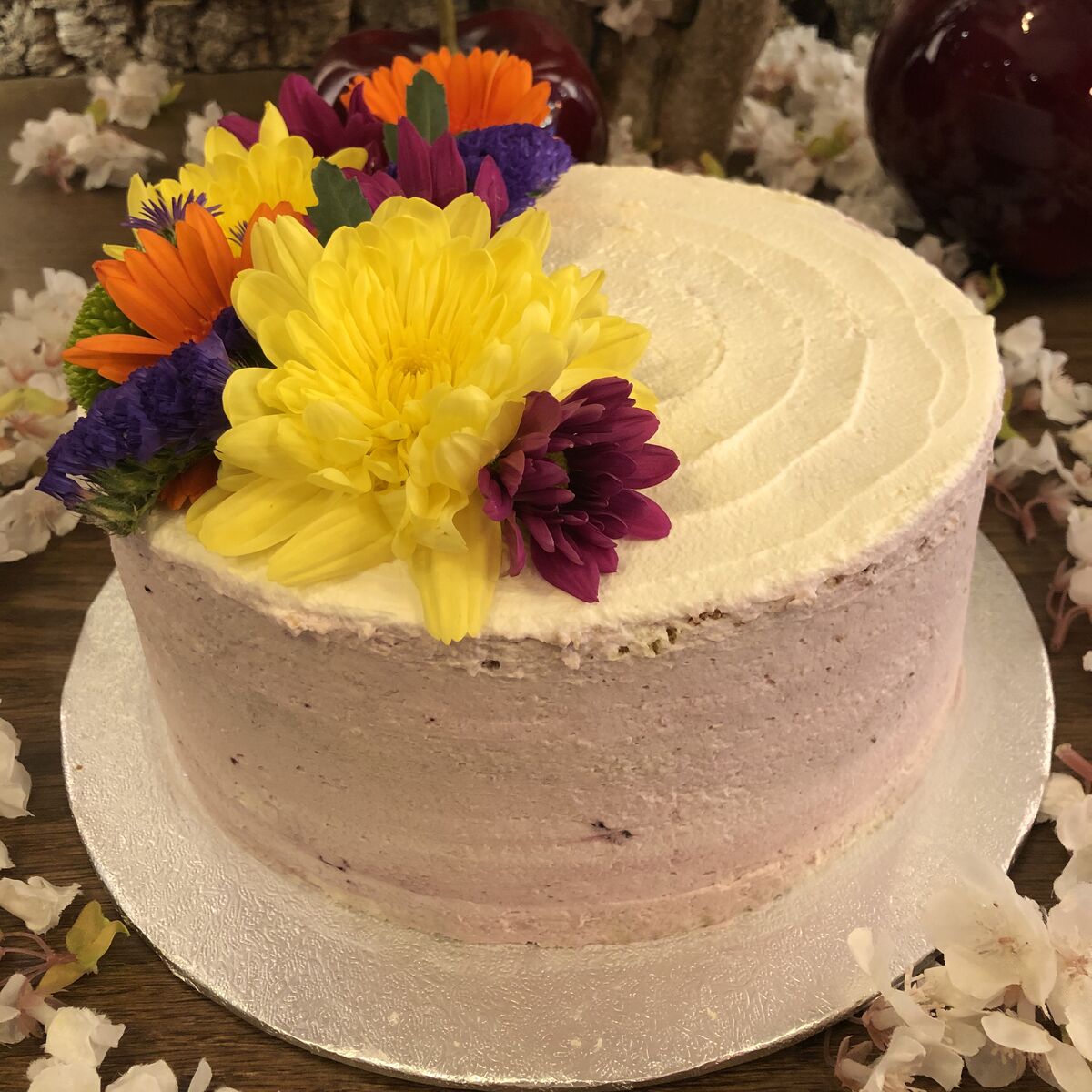 Vanilla sponge filled with Cherry cream , decorated with fresh Flowers, ...