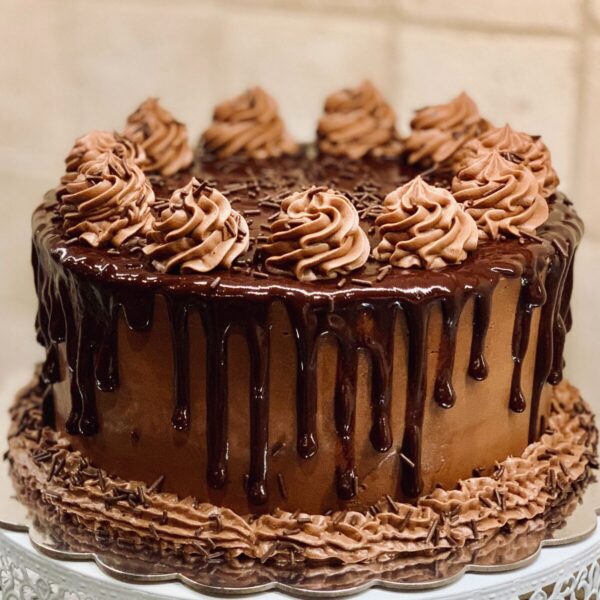 Chocolate Sponge filed and covered with Belgium Chocolate Cream and decorated with Chocolate Dripping and cream.