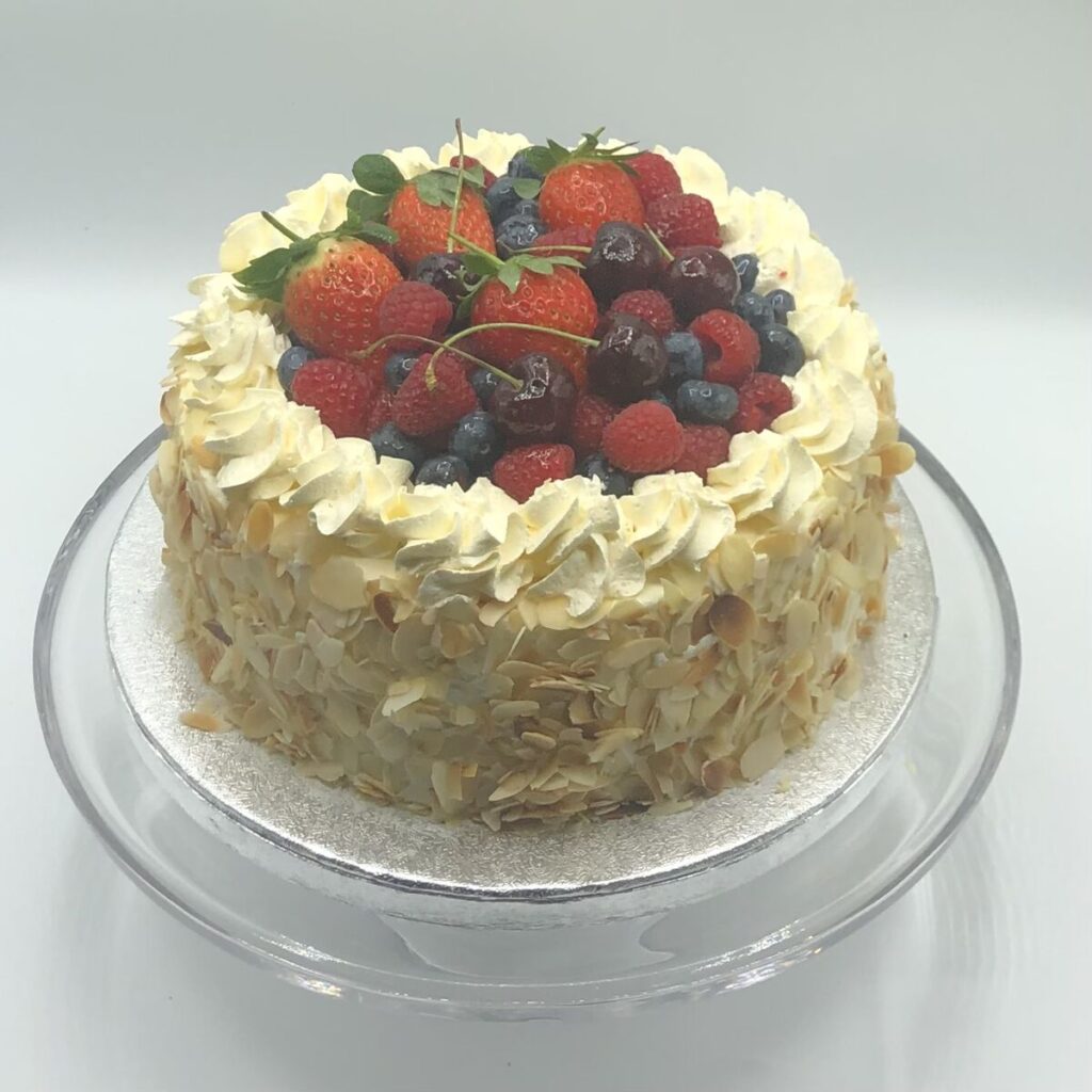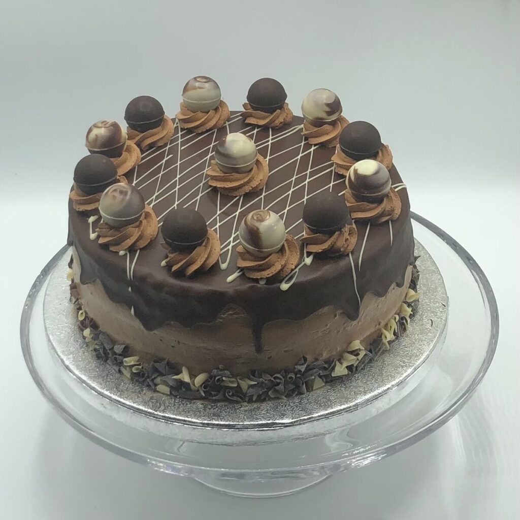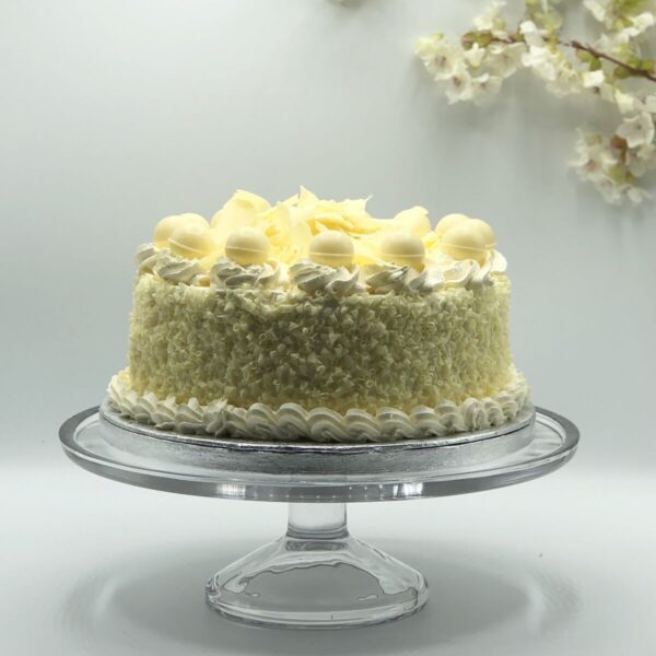 Description: Chocolate sponge layered with fresh cream, Coated with white chocolate curls and finished with White Chocolate Shaving on Top.