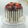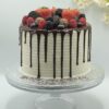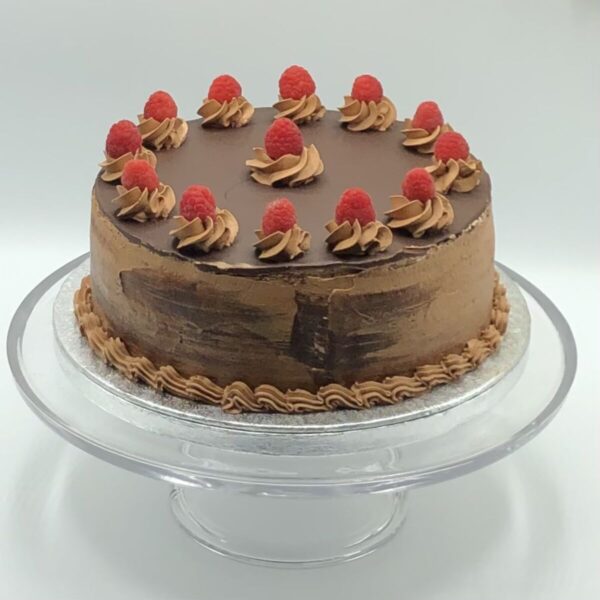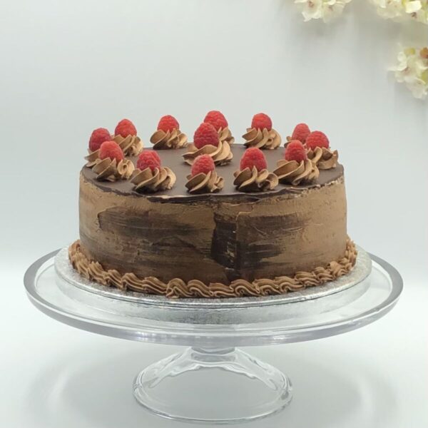 Chocolate Sponge filed and covered with Nutella Cream and decorated with Chocolate Ganache and Fresh Raspberries.