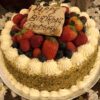 Vanilla Sponge layered and covered with Pistachio Cream, surrounded with ground Pistachio, and decorated with Mix berries on top.