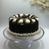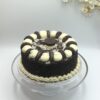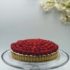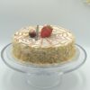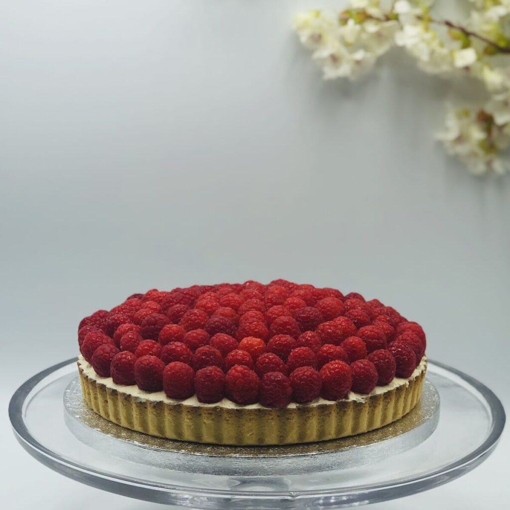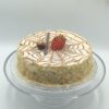 Vanilla Sponge layered and covered with Pistachio Cream, surrounded with ground Pistachio, and decorated with Mix berries on top.