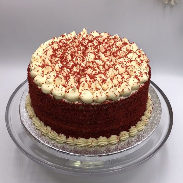Red Velvet Sponge layered and covered with Cream Cheese Frosting, finished with Red Velvet Crumbles