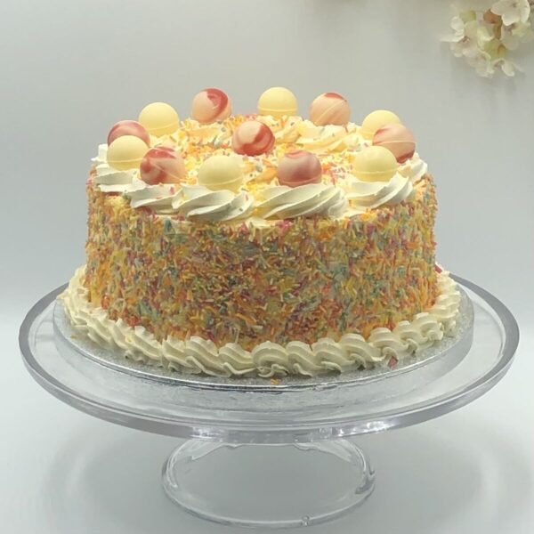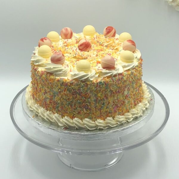 Vanilla sponge cake filled with fresh cream strawberries and bananas, surrounded with rainbow sprinkles, decorated with pink and white chocolate.