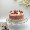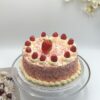 Vanilla sponge cake filled with fresh cream strawberries and bananas, surrounded with rainbow sprinkles, decorated with pink and white chocolate.
