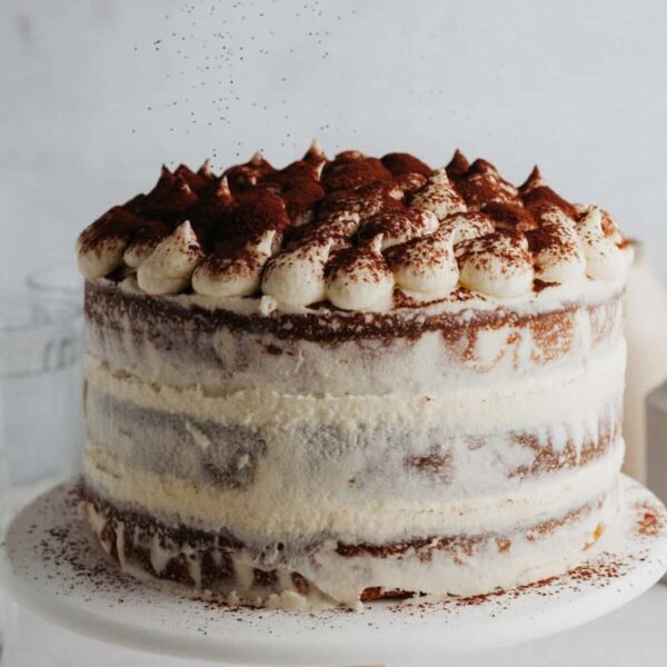 Round Coffee-flavoured Italian dessert made of ladyfingers dipped in Expresso Coffee, layered with a whipped mixture of eggs sugar and mascarpone cheese, flavoured with cocoa.